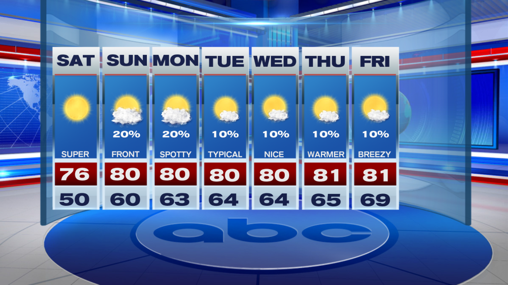 Looking ahead to next week, its looking fairly warm with a mix of sun and clouds each day, and highs in the 80s and lows in the 60s. We’re not seeing any strong cold fronts on the horizon.