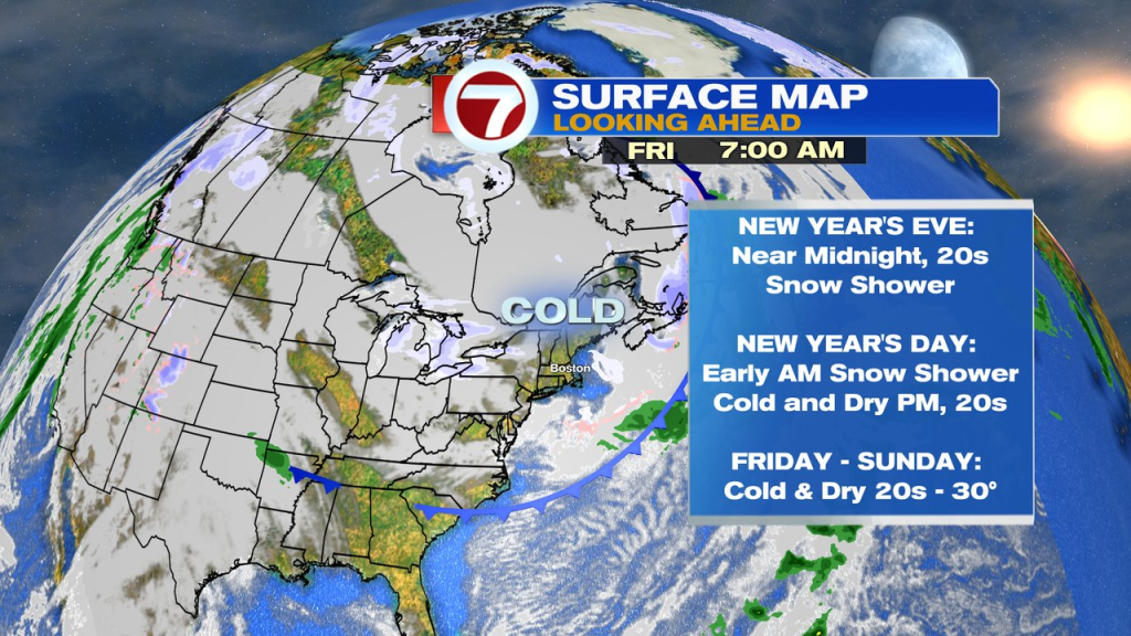 New Year’s Eve night is cold, with temps slipping back into the 20s during the evening. As a cold front slips through, a few scattered snow showers get going late at night, lingering into early Thursday morning. There’s not a lot of moisture with this front, so we’re just expect patchy coatings- 1″ with these snow showers. Plan on midnight temps in the low to mid 20s for the ball drop, and then back into the teens by daybreak on New Year’s Day.