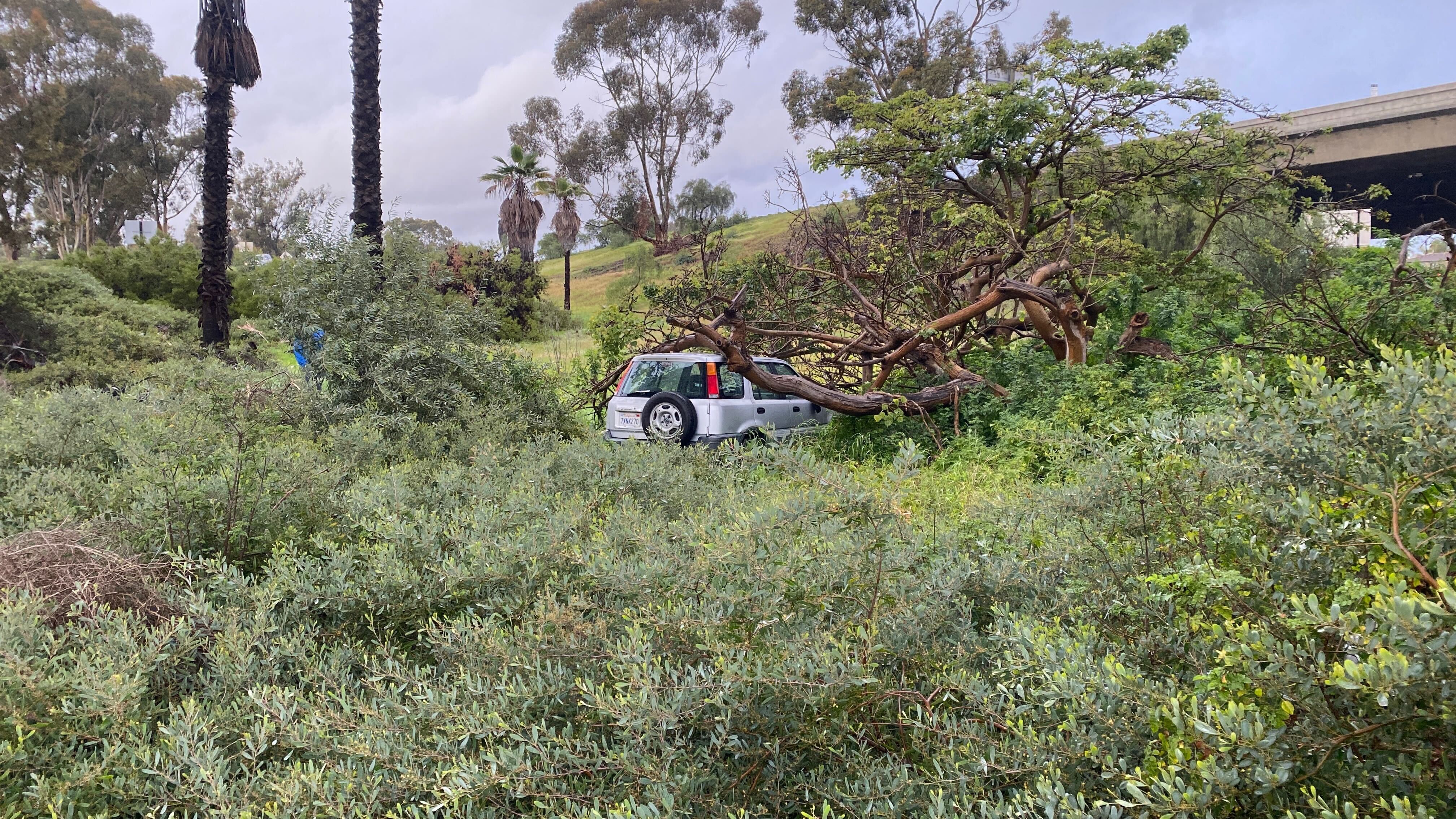 And on Monday, a car was found in the shrubs, with a tree toppled on it, near Interstate-805 on Palm Avenue and 47th Street in National City. No other information about the scene was immediately available.