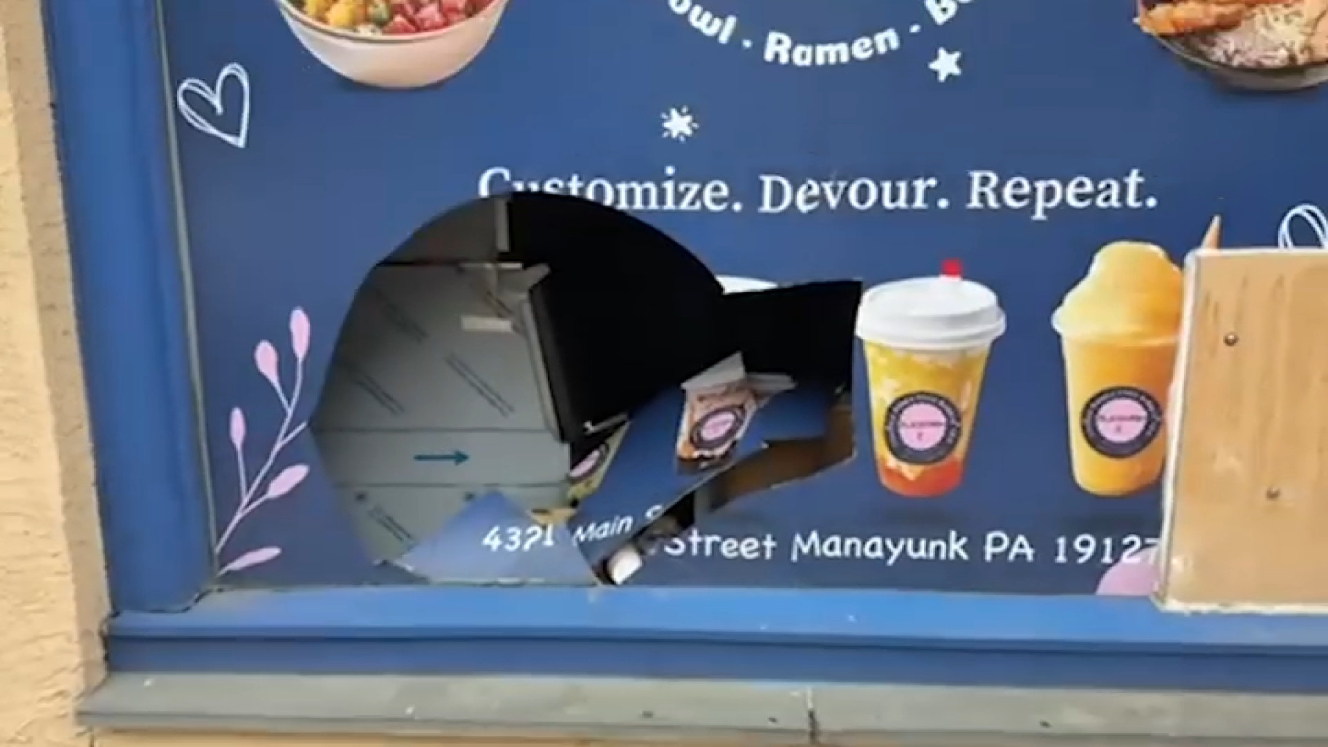 Surveillance video shared with NBC10 also showed the incident where at least one person can be seen smashing the side window, causing a gaping hole in the business.