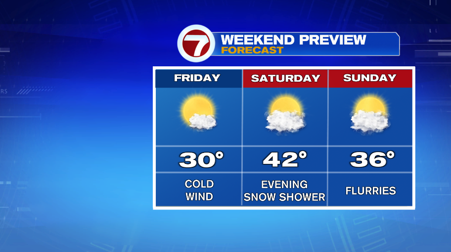 That cold air will take hold Friday with highs topping out near 30°, with the cold wind making it feel more like 20° on Friday afternoon. Thankfully the weekend is a little better. Actually, Saturday isn’t a bad day. We’ll have sunshine in the morning with increasing clouds in the afternoon. With the morning sun and highs in the lower 40s, that’s not a bad winter day. The increasing clouds are ahead of a few snow showers in the evening on Saturday. A few flurries will linger through Sunday and Monday of next week.