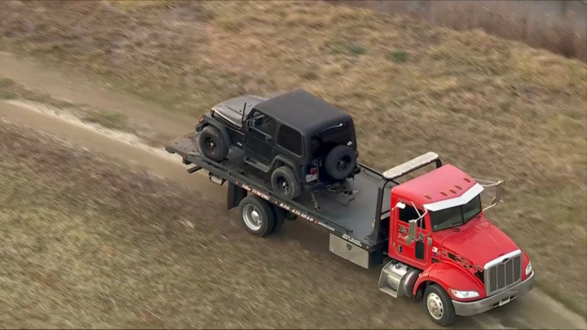 SkyForce10 was over the scene around 4 p.m. on Dec. 31 as a black Jeep Wrangler with the license plate “RUNT 61” was being towed on a flat bed tow truck followed by at least one police car.