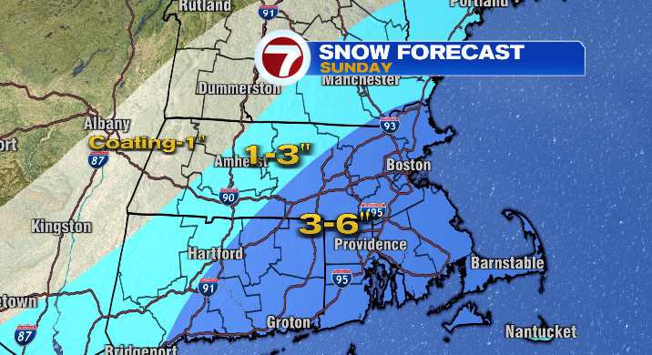 A widespread 3-6 inches of snow is expected with the highest amounts likely along the South Shore, least in northern Worcester County.