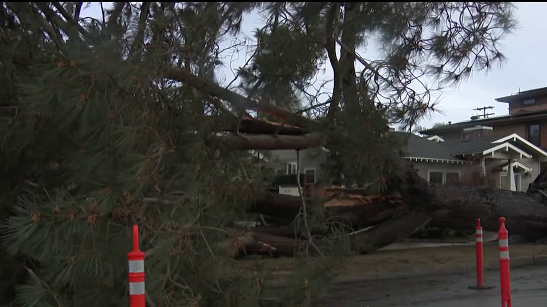 A storm battered San Diego County on Monday, toppling trees, flooding urban areas, and dousing the county in impressive rain totals before a brief respite on Tuesday.