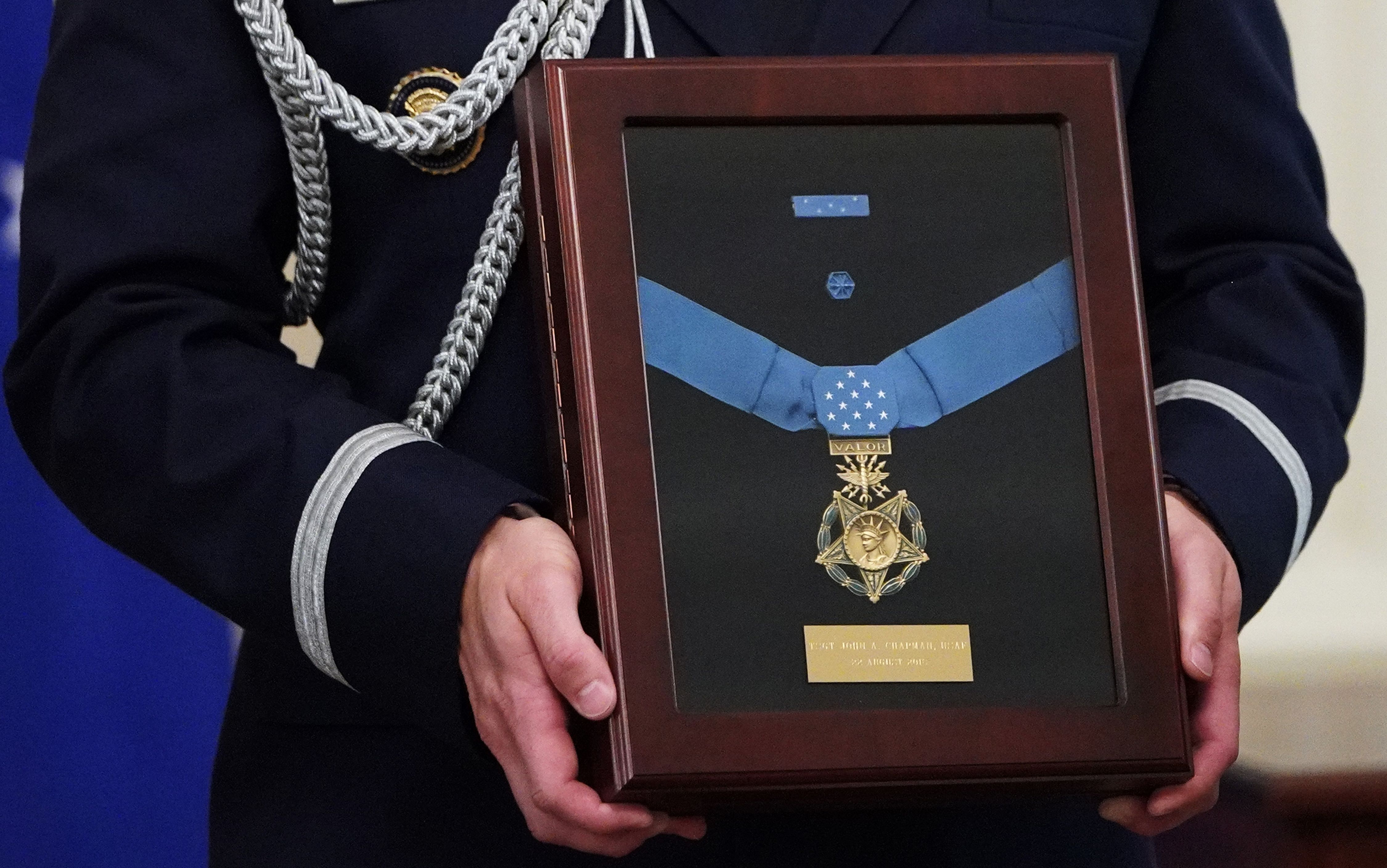 “On this date, during his helicopter insertion for a reconnaissance and time sensitive targeting close air support mission, Sergeant Chapman’s aircraft came under heavy machine gun fire and received a direct hit from a rocket propelled grenade which caused a United States Navy sea-air-land team member to fall from the aircraft,” the Medal of Honor citation read.