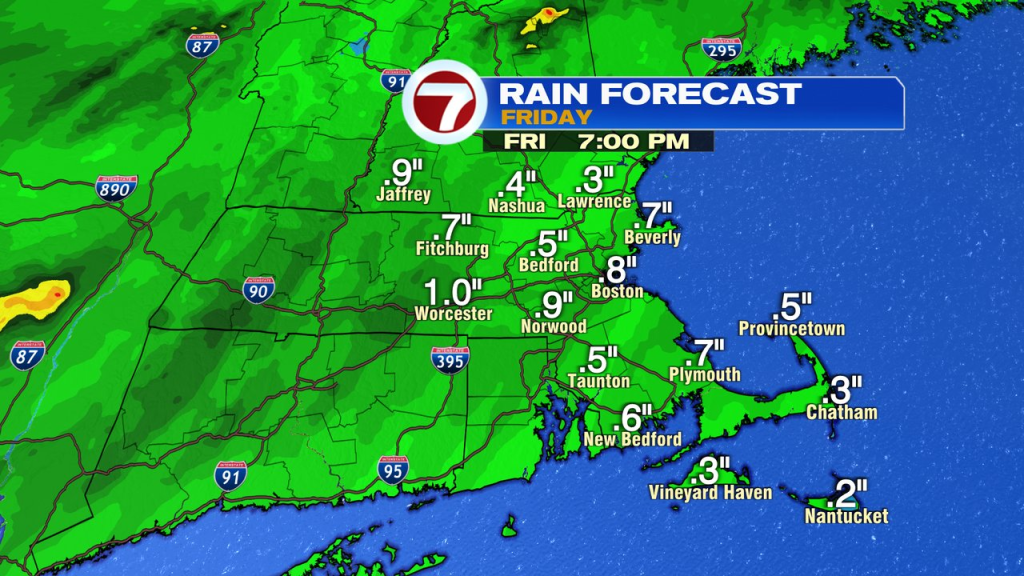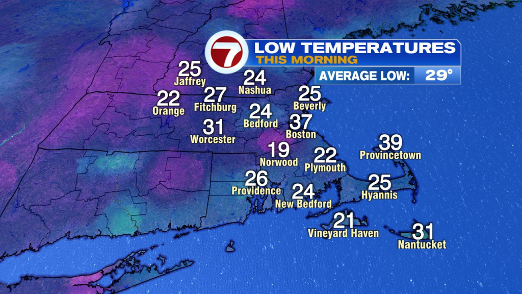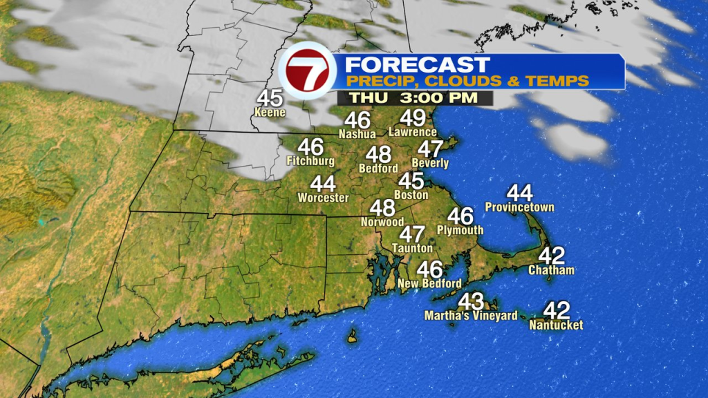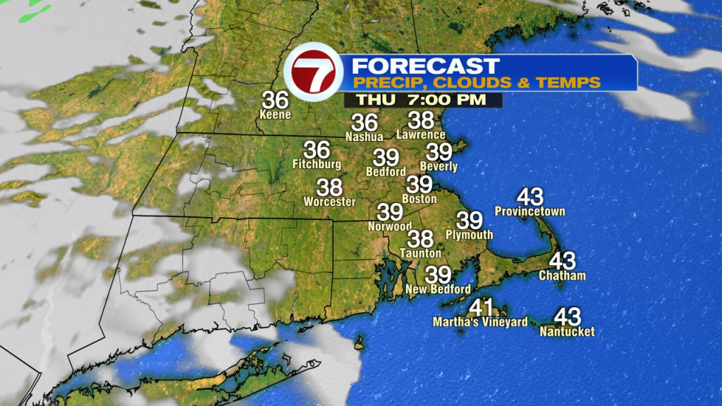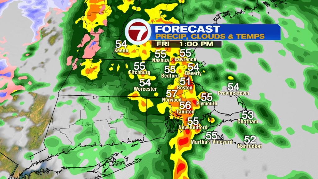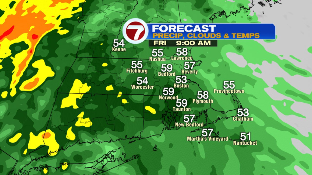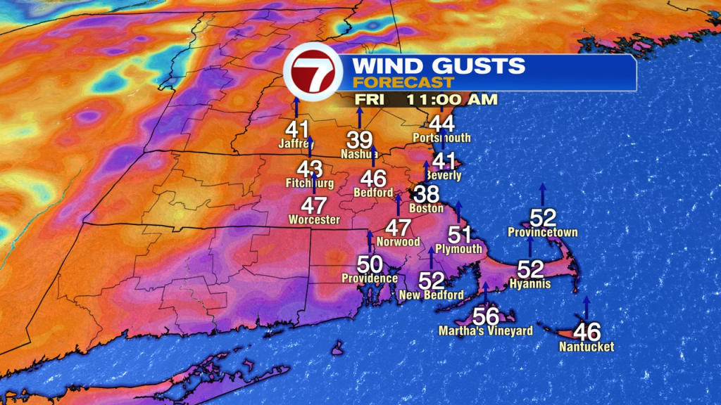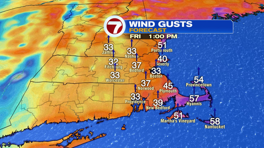 Temps slide into the 30s this evening, then go back up overnight tonight as clouds increase and scattered showers develop after midnight. By tomorrow morning, many of us are in the 50s as rain increases it’s coverage area mid morning, through early afternoon. That rain will be heavy at times as winds increase out of the south too. Gusts peak mid morning to early afternoon in the 40-60mph range, strongest across the Cape and Islands, where a high wind warning is in effect.
