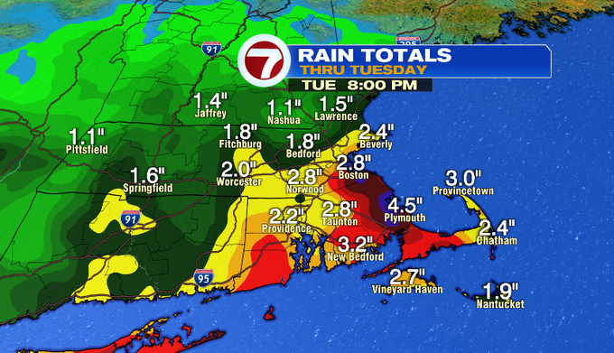 Rain totals will range northwest to southeast from 1-3″ for most. Higher amounts near/above 4″ are possible for parts of southeast Mass.