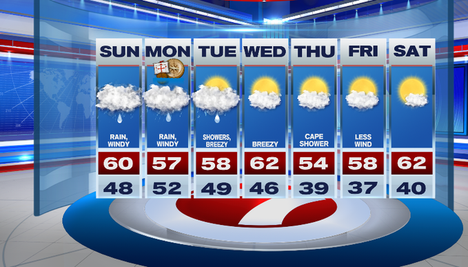 Today’s highs will be cooler in the upper 50s/near 60. We stay cool in the upper 50s through Tuesday. The sunshine returns for us on Wednesday. It stays breezy with wind out of the northwest Wednesday and Thursday. Thursday there’s a chance for a shower mainly for the Cape. Finally the wind relaxes by the end of the day Friday. We’ll have less wind, and it will be nice Saturday.
