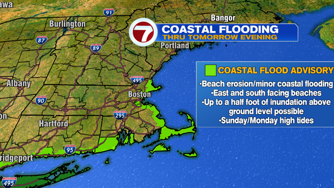 The persistent push of onshore wind and coming off higher tides will lead to minor coastal flooding and beach erosion. We’ll watch for shallow pockets of flooding and splashover around the high tides this evening through tomorrow.