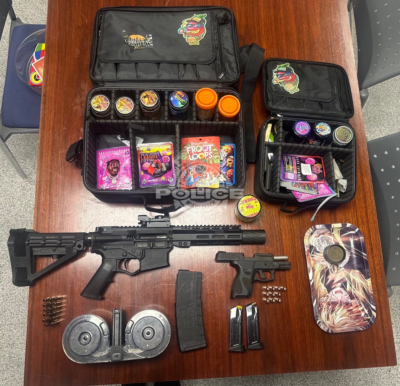 Images of some of the items seized include various guns and what appear to be drugs in packages, including one resembling a popular cereal brand.