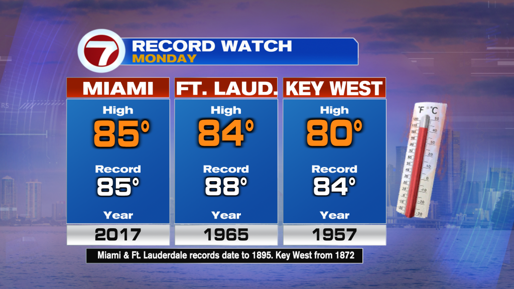 We’ll be flirting with record heat during the day Monday with highs in the mid 80s before the cold front arrives during the afternoon, with some isolated showers along and ahead of it.