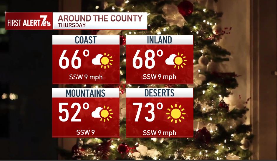 Don’t expect the tree-whipping winds that many San Diegans woke up to on Wednesday for Christmas Day, as wind gusts will have died down significantly in time for the holiday, according to NBC 7 meteorologists.
