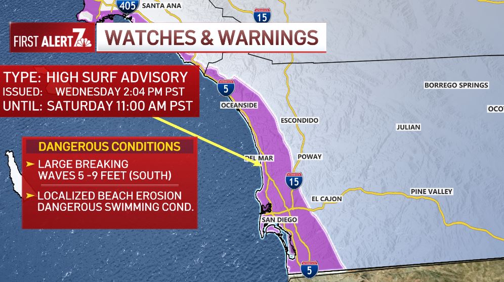 The surf is also up this week, but with the winds at the coast, surfing conditions will be far from ideal. Waves will average between 5 to 8 feet with swells up to 9 feet. High risk of rip currents, and minor flooding and beach erosion is possible. A High Surf Advisory will remain in effect until 11 a.m. Saturday.