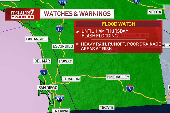 NBC 7’s Dave Summers was in North County for the Christmas Eve storm, where Caltrans crews were keeping an eye on flooded roadways and last minute shoppers maneuvered standing water.