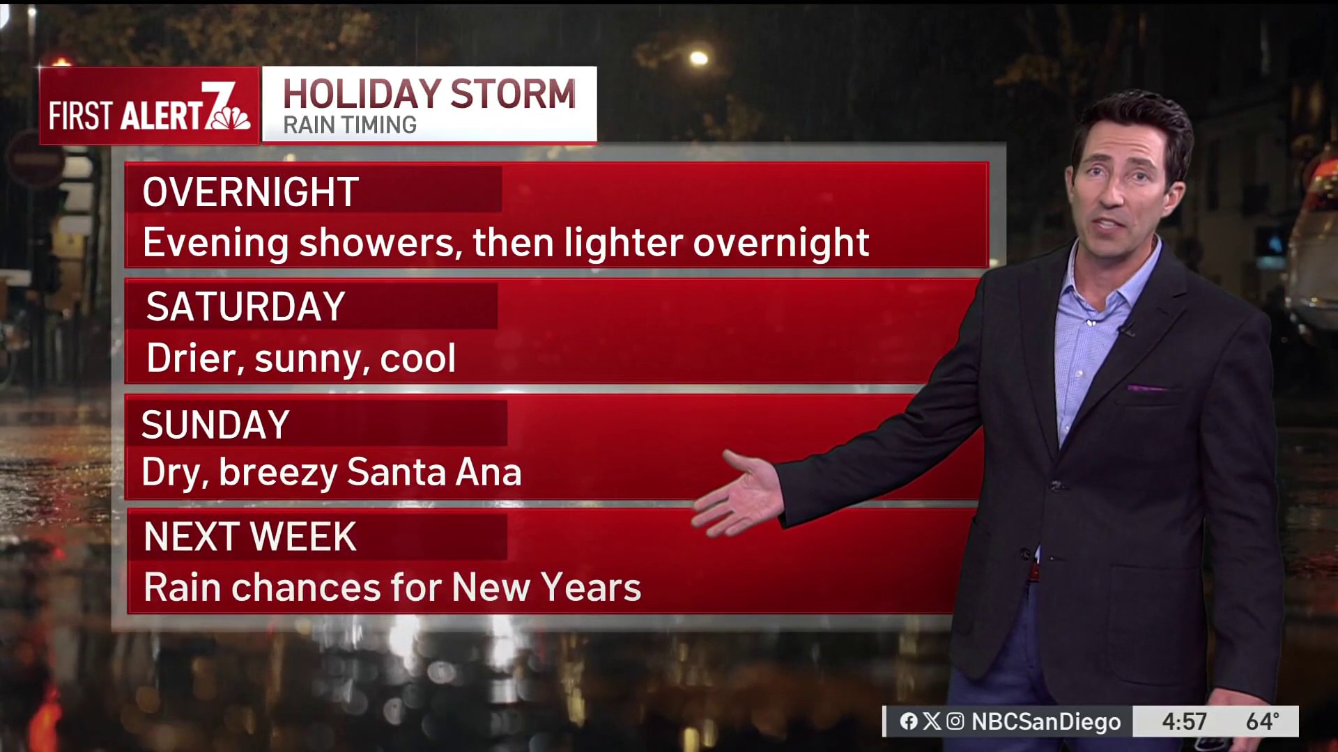 After your weekend fun, we’re in for some weather whiplash over the next week. Santa Ana winds will bring dry and warmer conditions from Sunday through Tuesday. Don’t pack away the parka just yet — rain chances return later next week around New Year’s Day, so take that into account when making your New Year’s Eve plans.