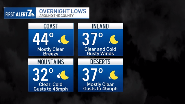 San Diego’s mountains and deserts will be under a Wind Advisory until 1pm. Wind gusts will range from 40-55mph, strong enough to bring down trees, powerlines, and to make difficult driving conditions for high profile vehicles. The winds will subside this afternoon but remaining gusty at times into tonight.