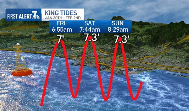 We have another round of King Tides this weekend timing up with the February full moon. Morning high tides will above 7 feet through Sunday. Wave height, however will be dropping a little bit for Saturday and again Sunday which should reduce the risk of coastal flooding.