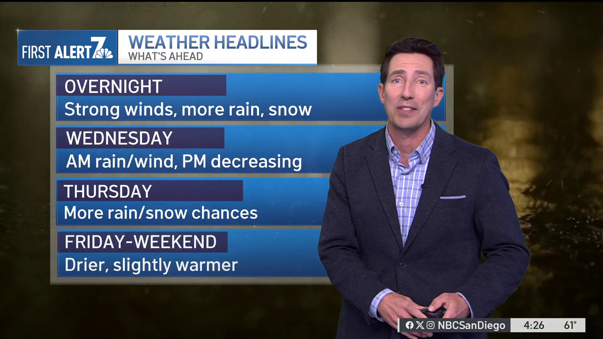 Round two of rain is expected to arrive late Tuesday night, bringing more precipitation, gusty winds and the possibility of a dusting of snow at lower elevations, according to NBC 7 meteorologist Greg Bledsoe.