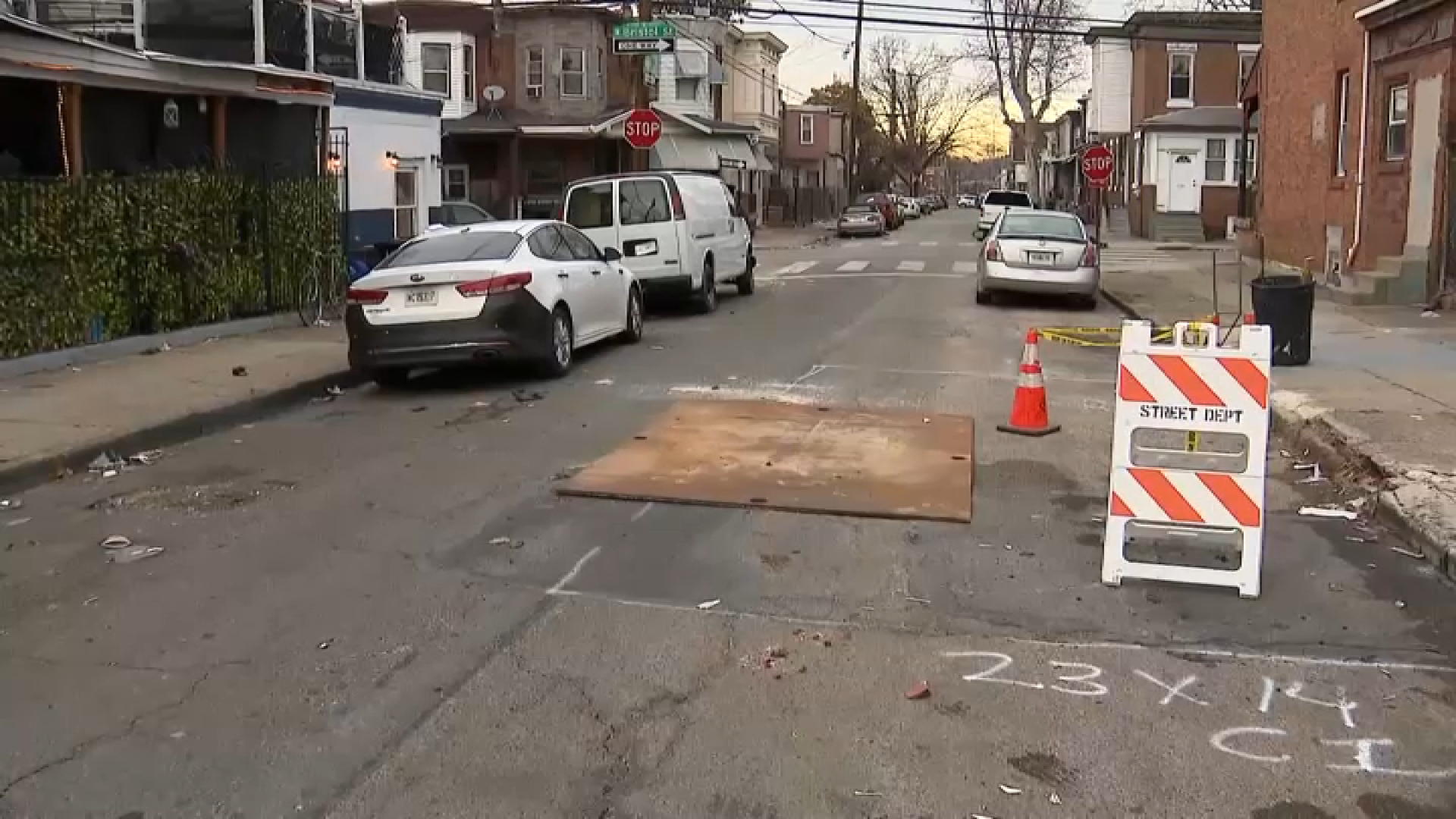 NBC10 was on the scene at the 4200 block of North 17th Street on Sunday to find a trash can inside the sinkhole to mark the hazard for drivers.