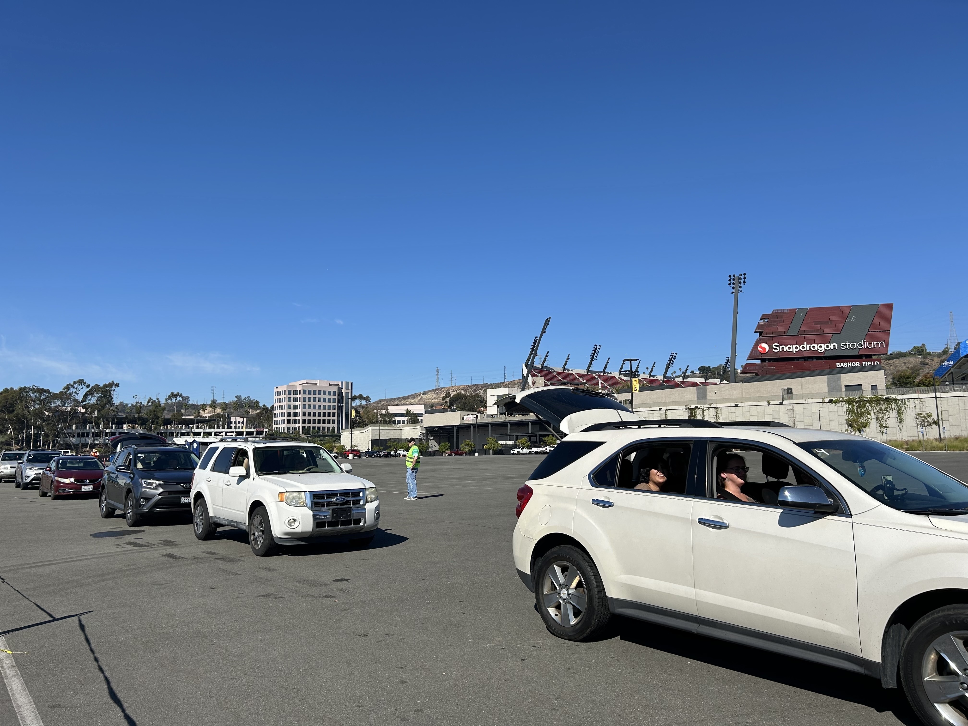 As Californians began to feel the reality of no CalFresh SNAP benefits, this weekend, there was an unannounced, by invitation, mass food distribution in the parking lot of Snapdragon Stadium on Sunday.