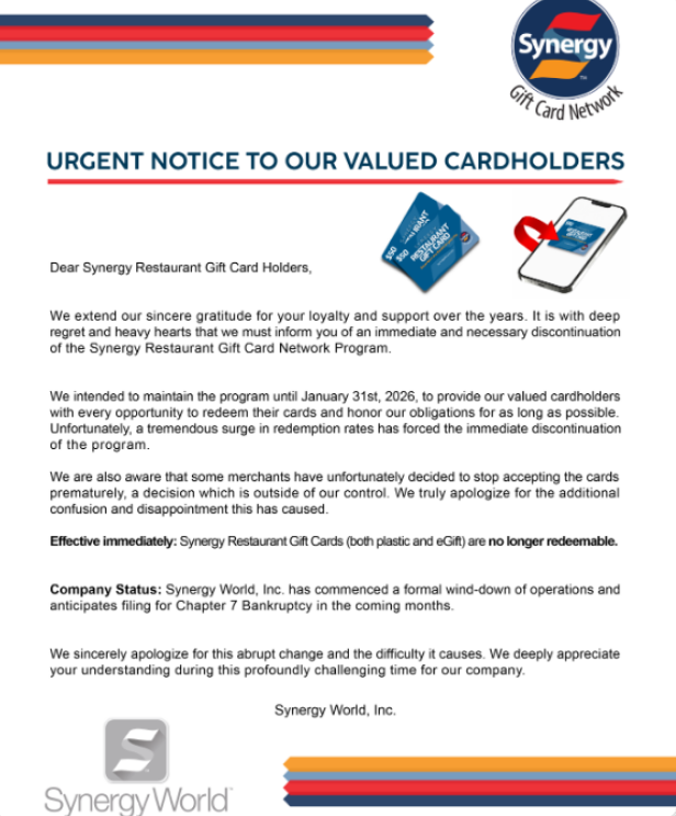 Synergy goes bankrupt, says time is up to redeem gift cards