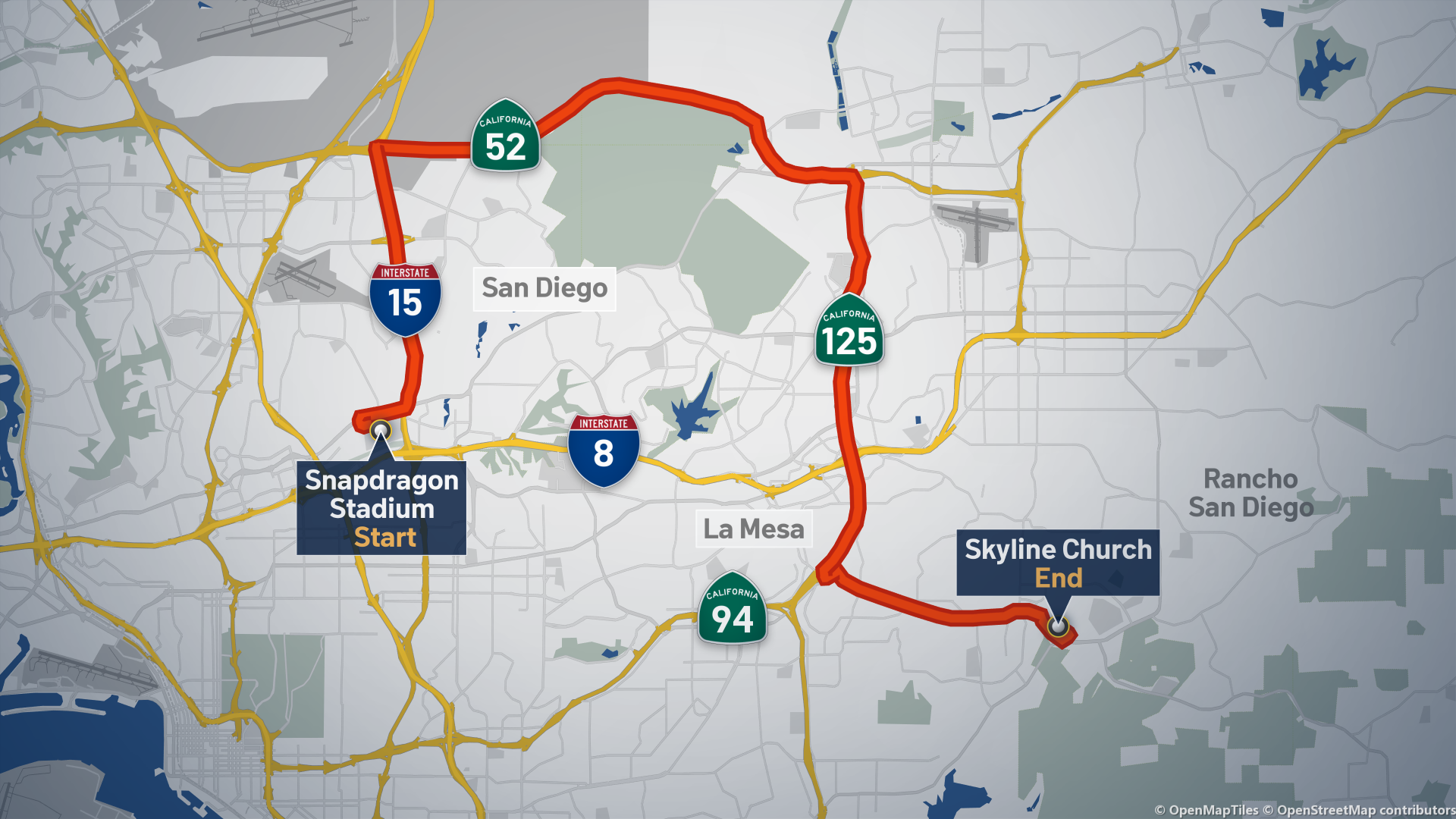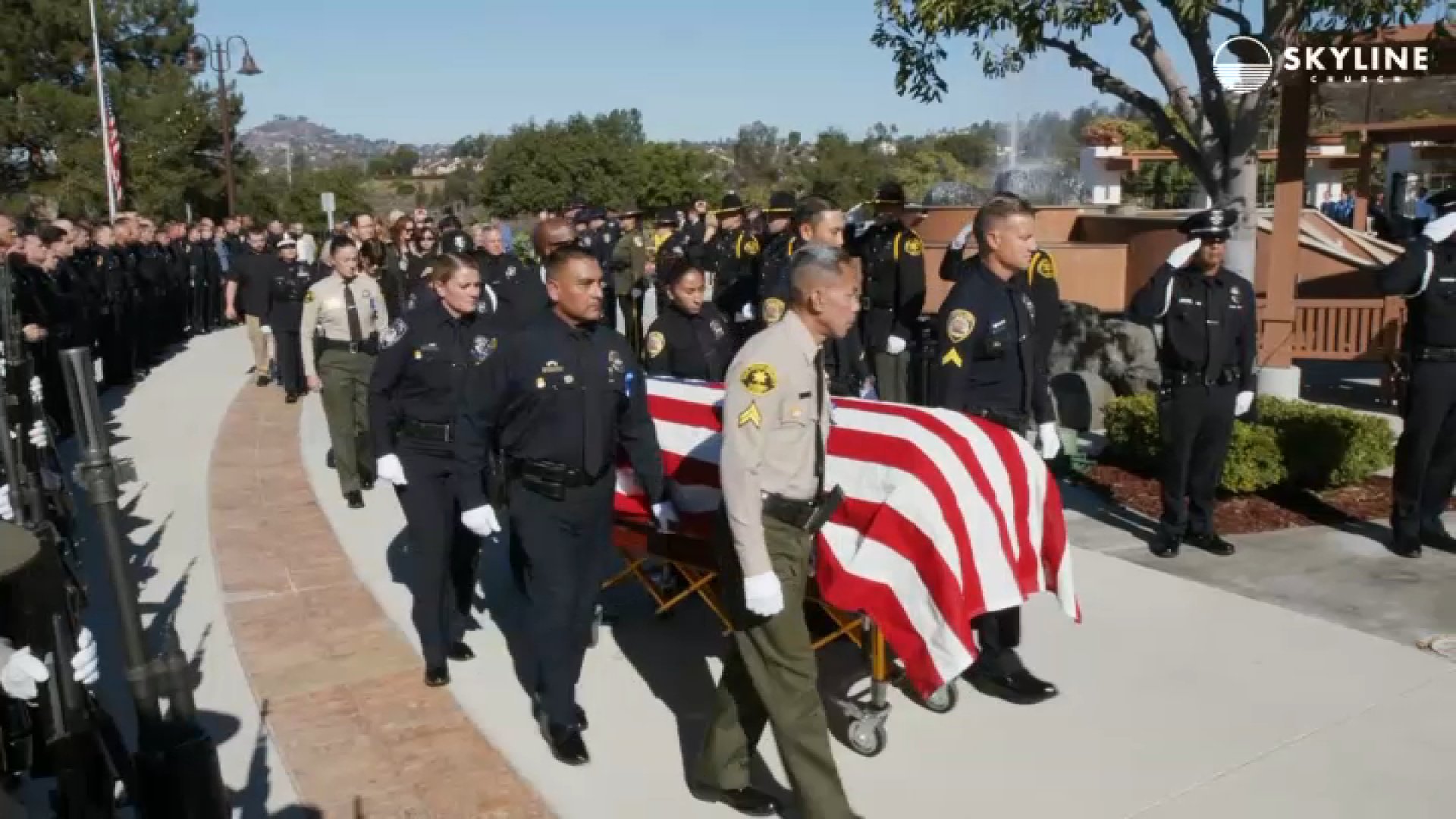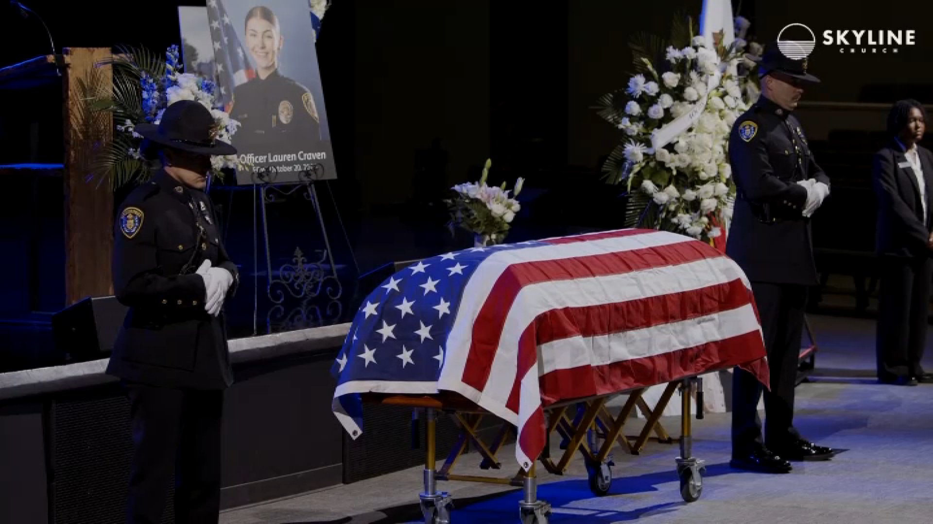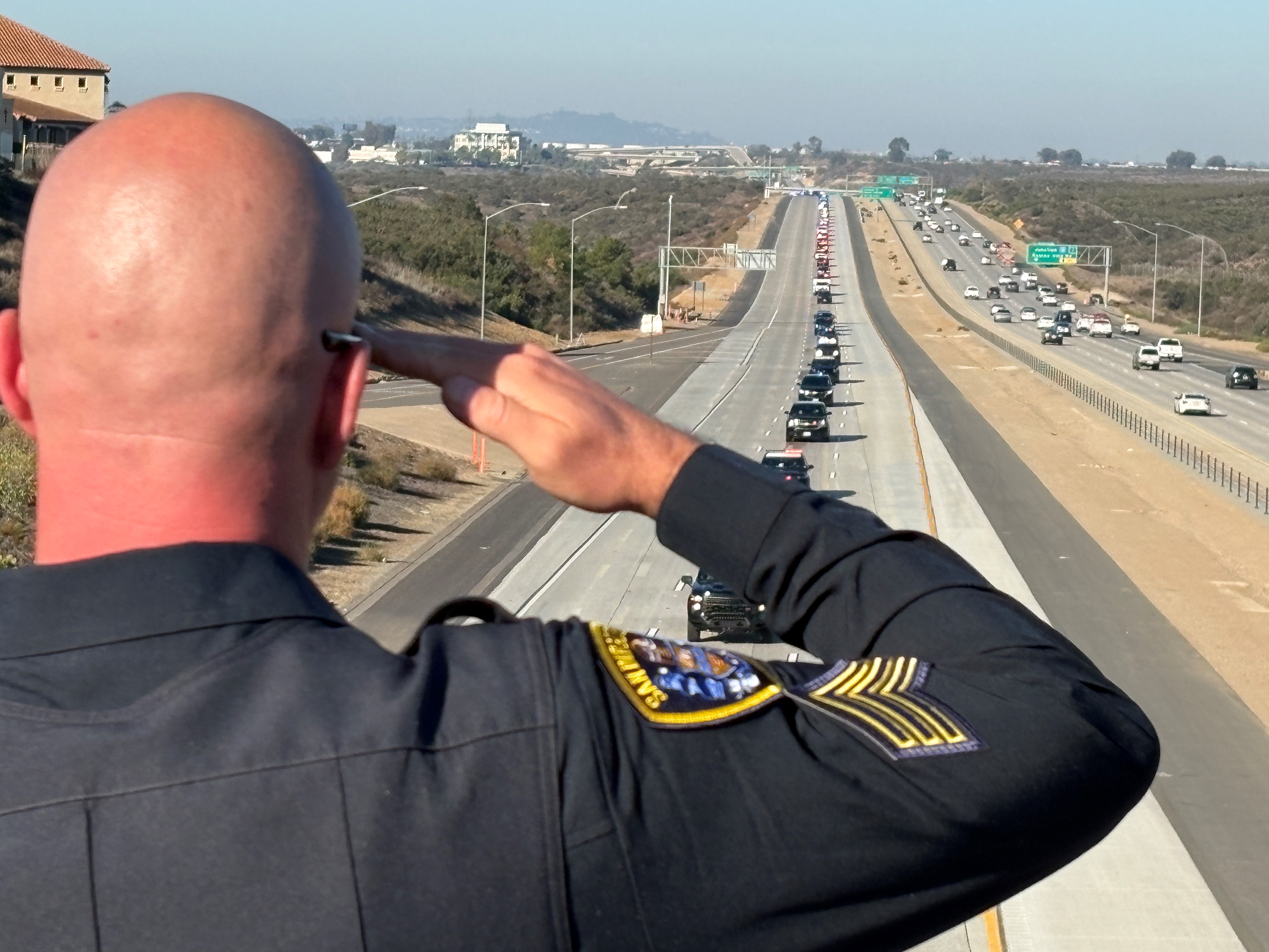 Tuesday morning’s services began with a long procession along local highways. Hundreds of first responders started at Snapdragon Stadium at around 8:30 a.m. and followed Officer Craven’s hearse.