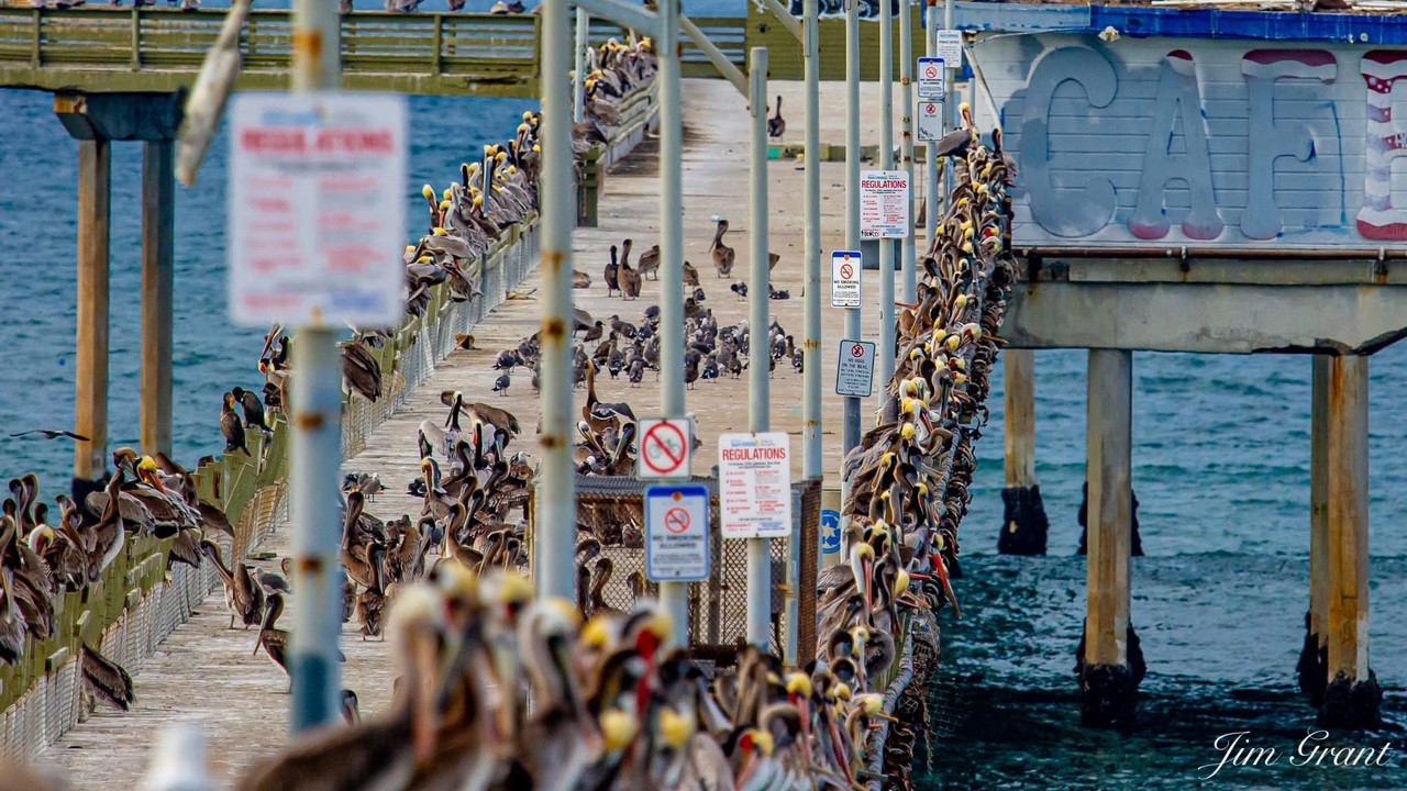 Still photographer Jim Grant, who has shared his photos with NBC San Diego for many years and has a special love for OB and, especially, for pelicans, was contacted by a friend, James McCabe, on Sunday afternoon. McCabe’s video of thousands of pelicans prompted Grant to hustle over to Ocean Beach to snap photos.
