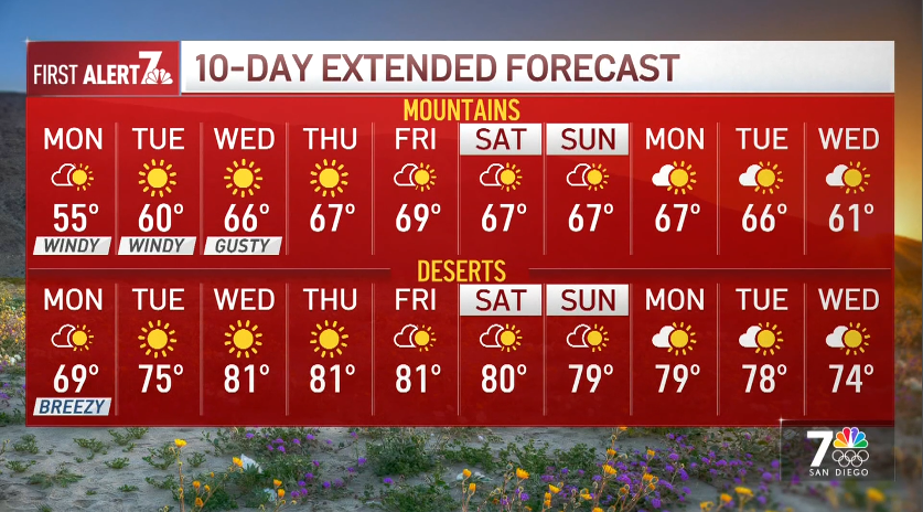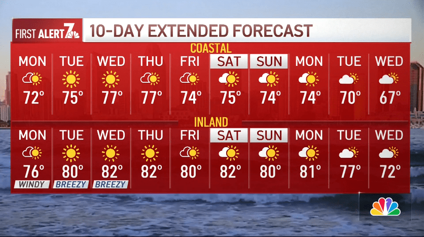 “The ridge of high pressure that’s keeping those Santa Ana winds in place is going to also provide a big warm-up for the middle towards the end of the week and then we head into the weekend, and we’ll settle right around 75 degrees,” said NBC 7 meteorologist Angelica Campos.
