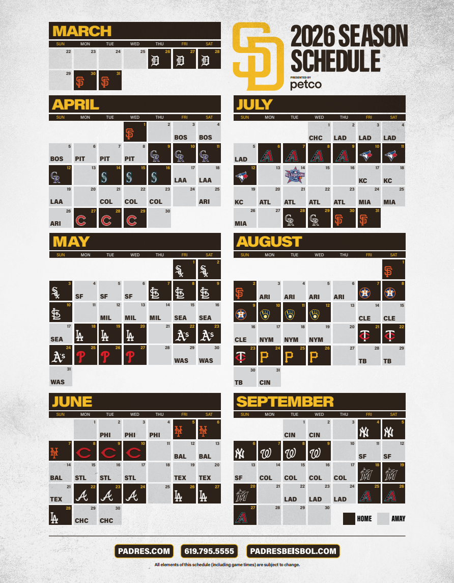 The Padres released their schedule which includes several interleague games and home games for Jackie Robinson Day on April 15, Mother’s Day on May 10, Memorial Day on May 25, and Labor Day on Sept. 7. See the full schedule here.